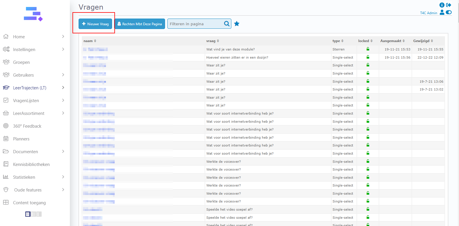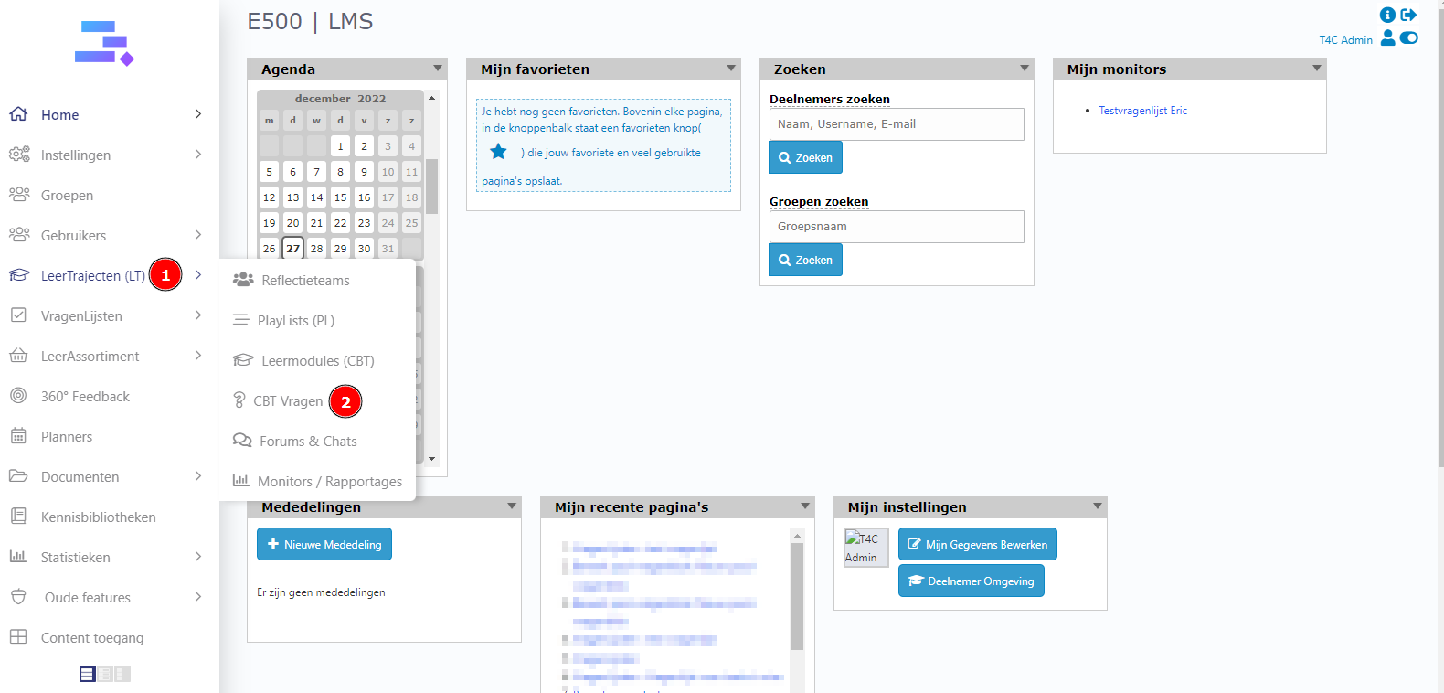 1. Login with your administration account. Hover into Leertrajecten and click on CBT Vragen.