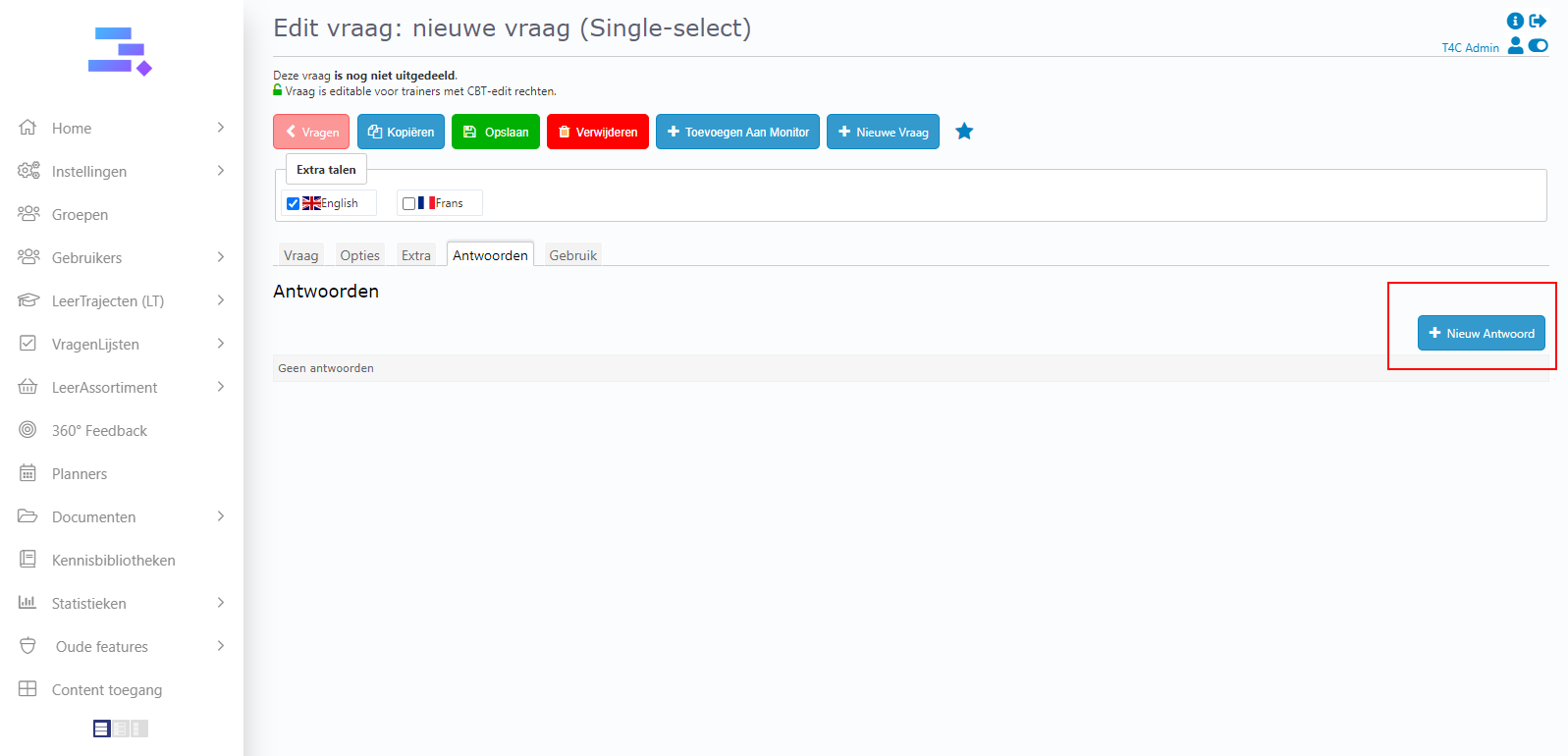 5. Go to the Antwoorden tab and click on Nieuw Antwoord to create an answer for the question.