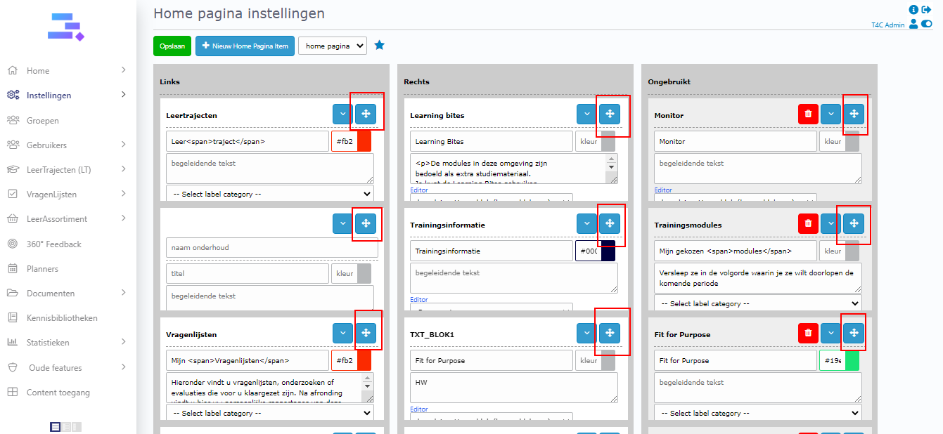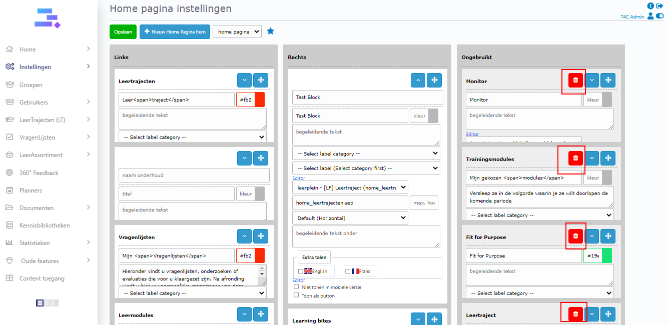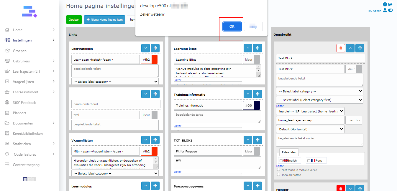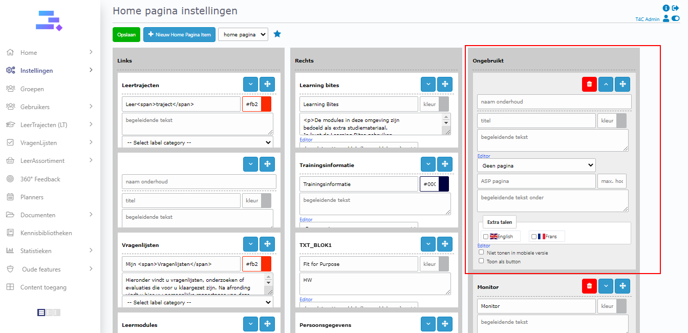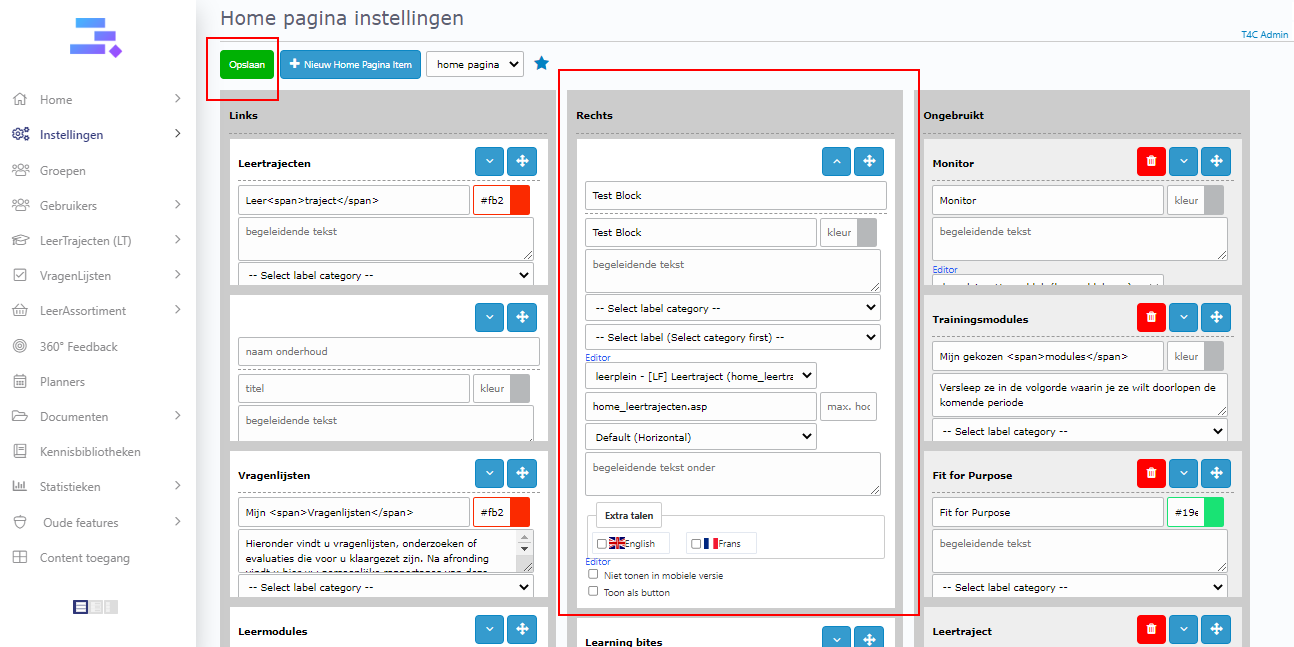 Click + nieuw home pagina item. Then a new block appears on column 3. You need to fill in all information and choose content available for block. Move it to column 1 or 2 to it can be displayed on the homepage. Don’t forget to click Opslaan to save all updates.