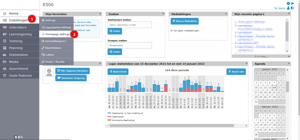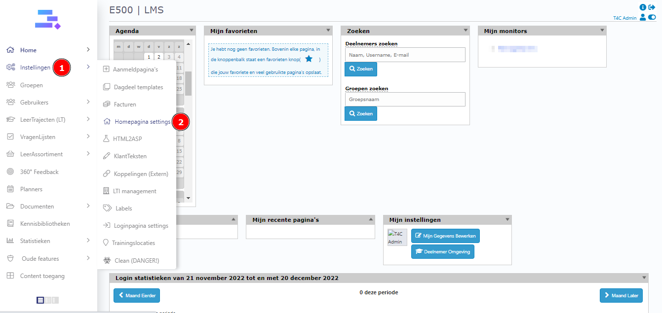 First, login with your administration account. Hover into Instellingen and click on Homepage settings.