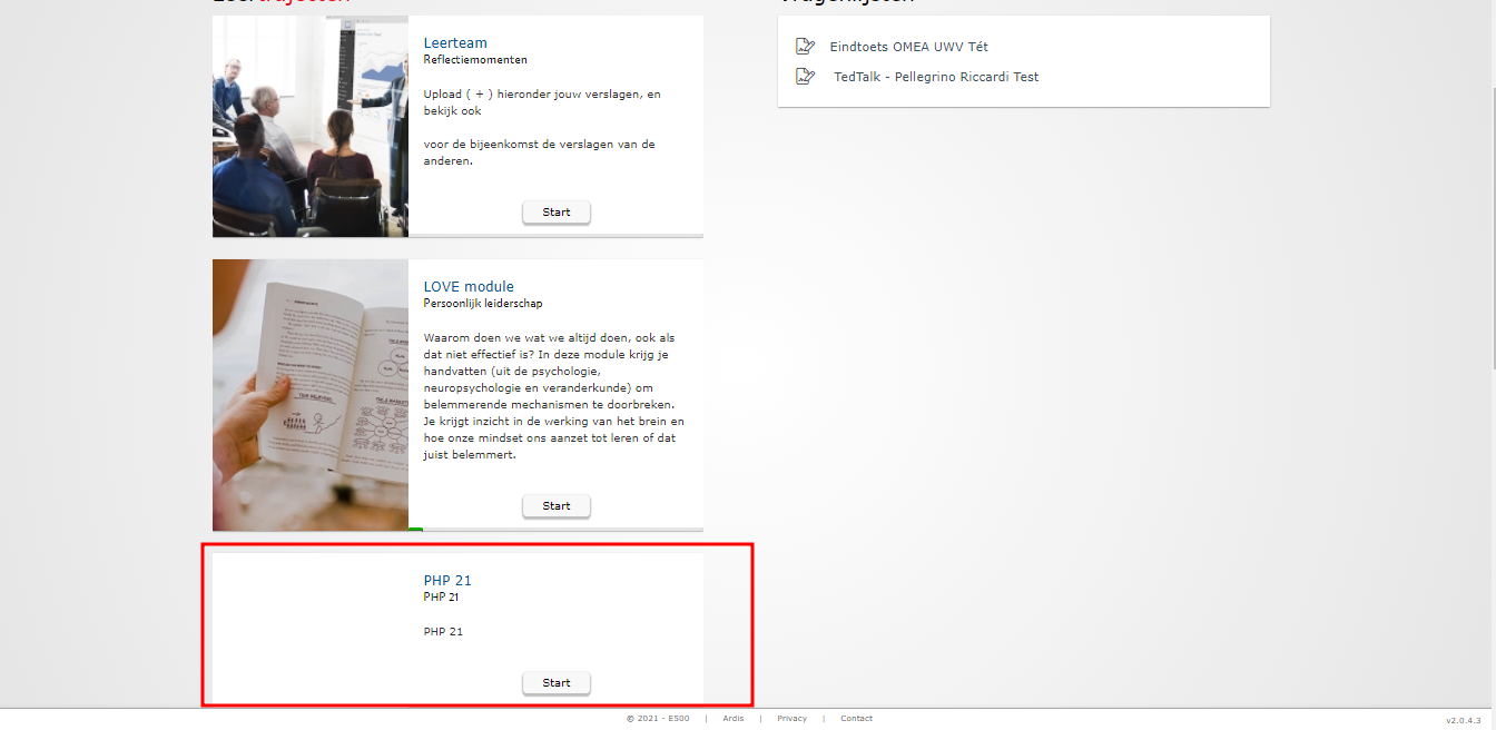 5. In the user’s detail, go to tab Content, in block Kiezen LeerTrajecten/ Playlists/ Leerteams, click icon v in the frame kies een leertraject. Scroll down and select the course that has been set up with the form chat.
