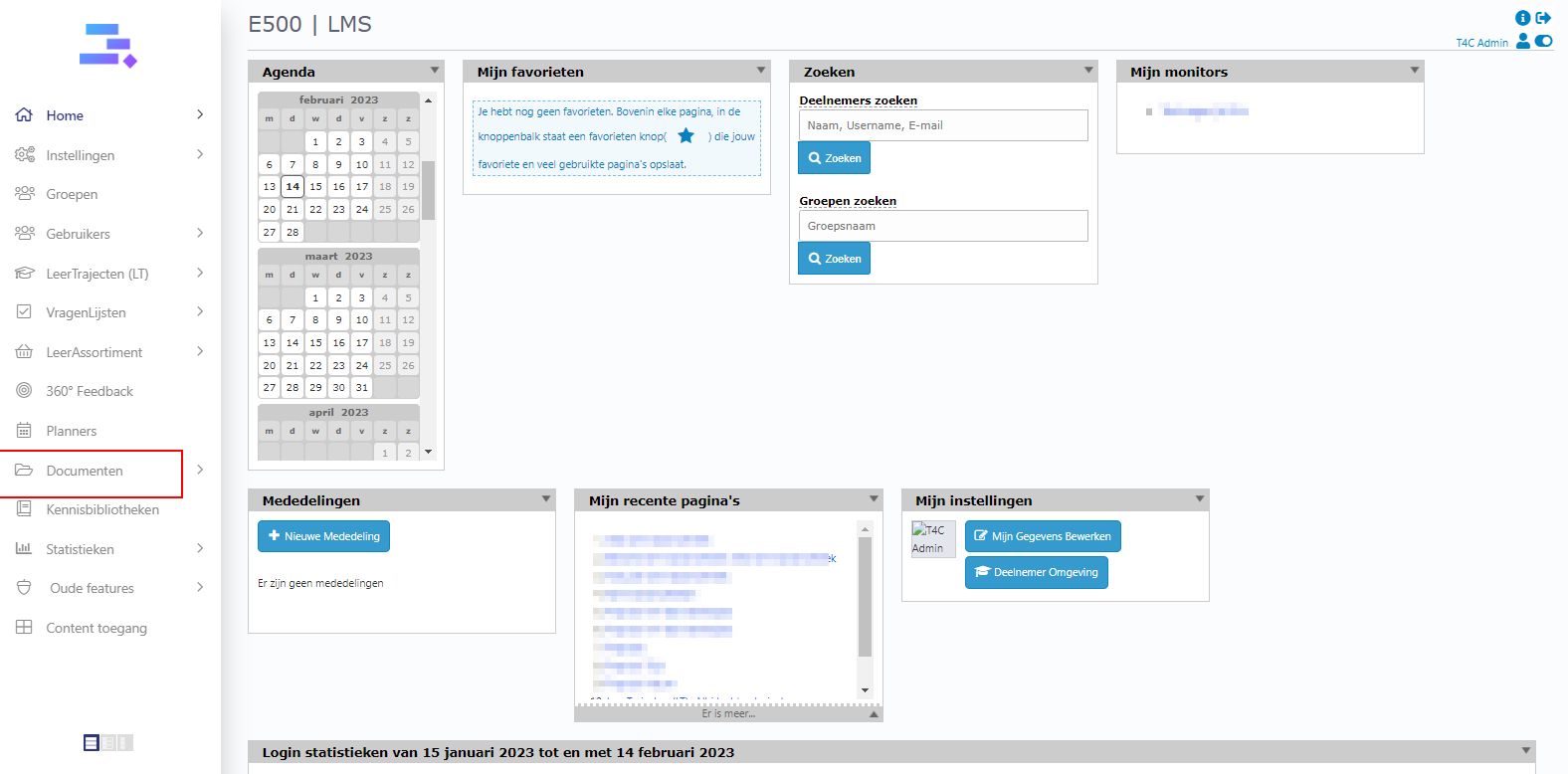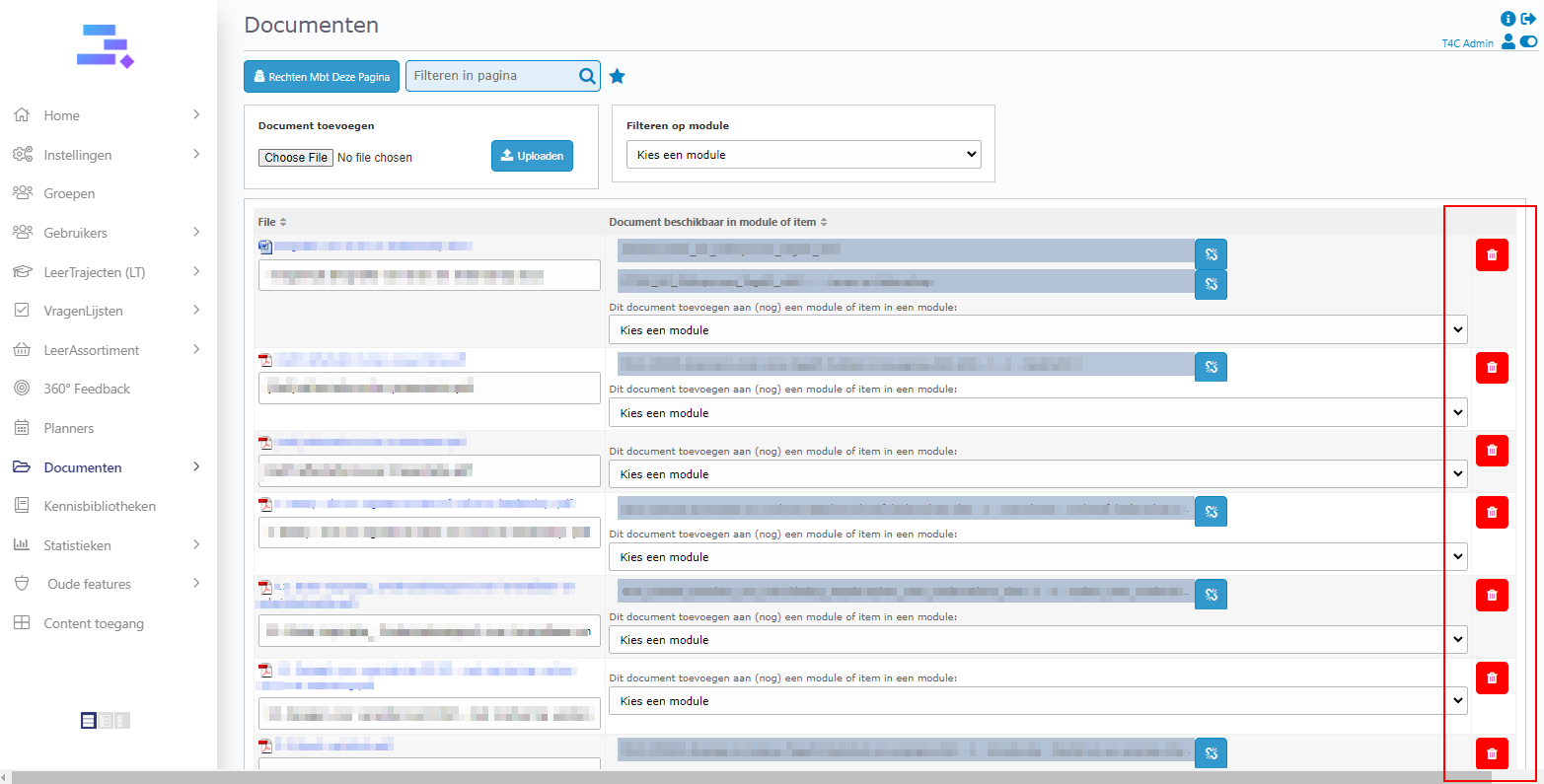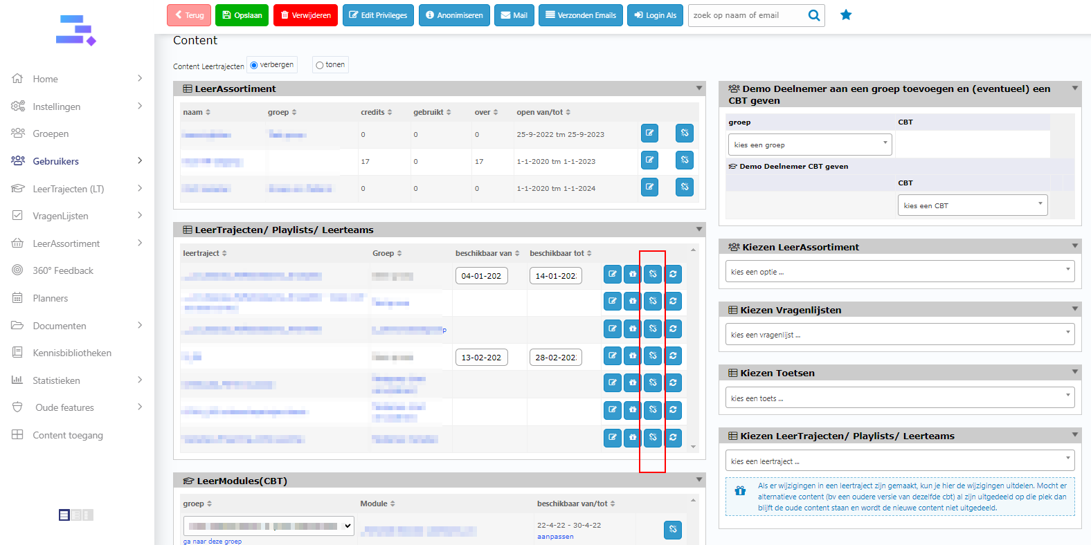 3. In the block Leertrajecten, click on the blue icon in the outermost right of the document that you want to remove from the Homepage of the user.