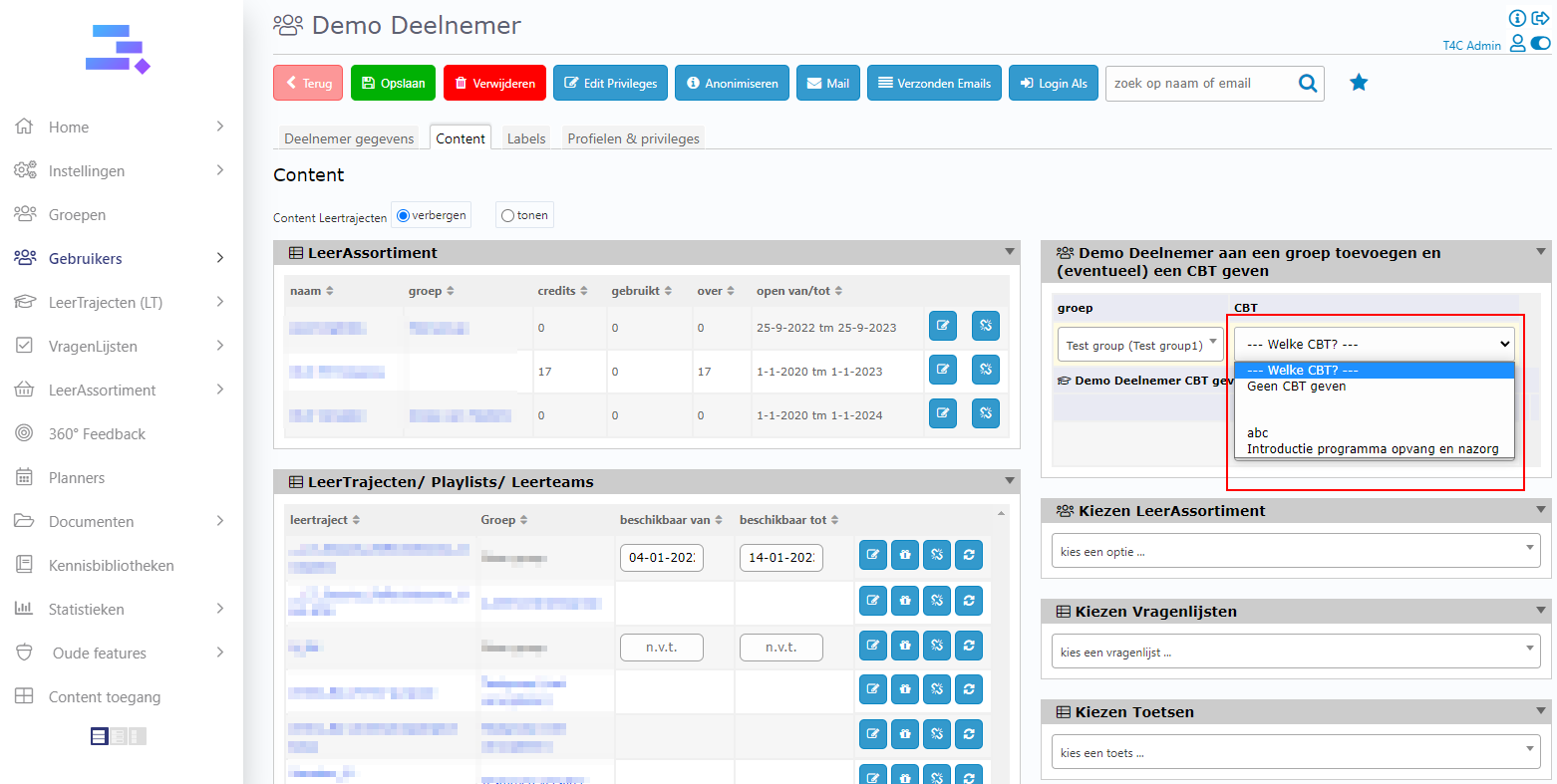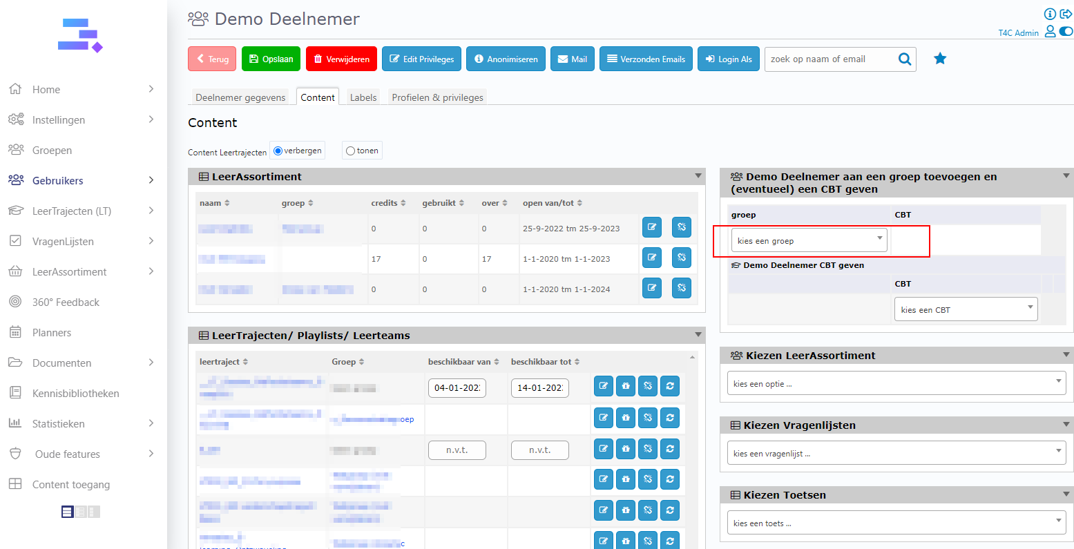3. Go to tab Content. Now you can see block Username + aan een groep toevoegen en (eventueel) een CBT geven. Click dropdown button kies een option… to choose a group where you want to add the user to.