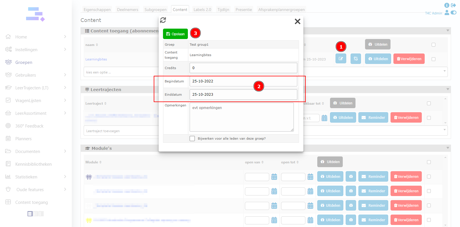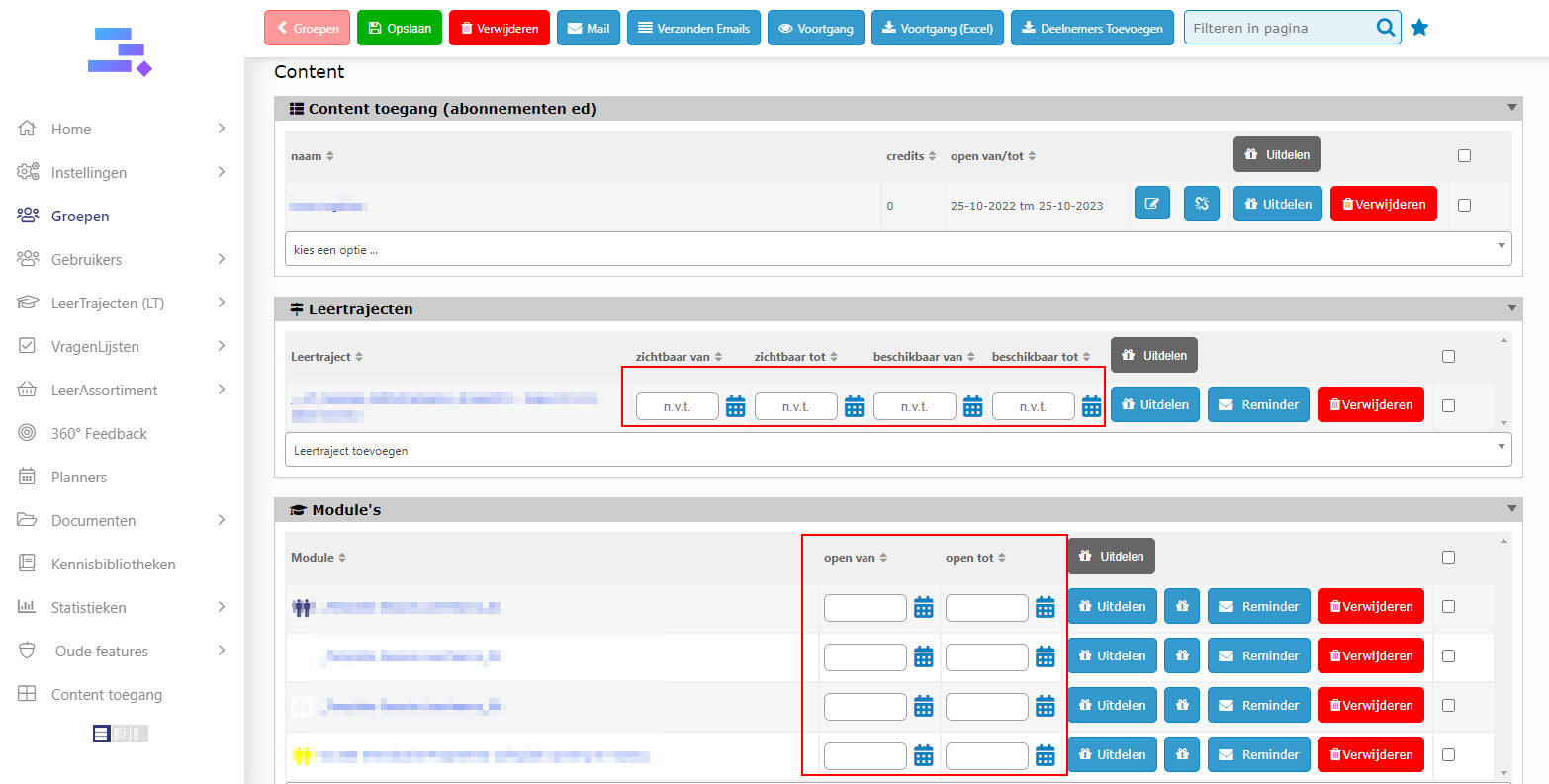 For Content toegang, click on edit button. Then you can see the inputs to change date. After change it, don’t forget to click Opslaan to save