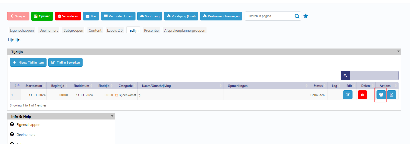 Now you can see a Bijeenkomst are created in the table. Click on group icon then you will see the pressentation! Good luck!