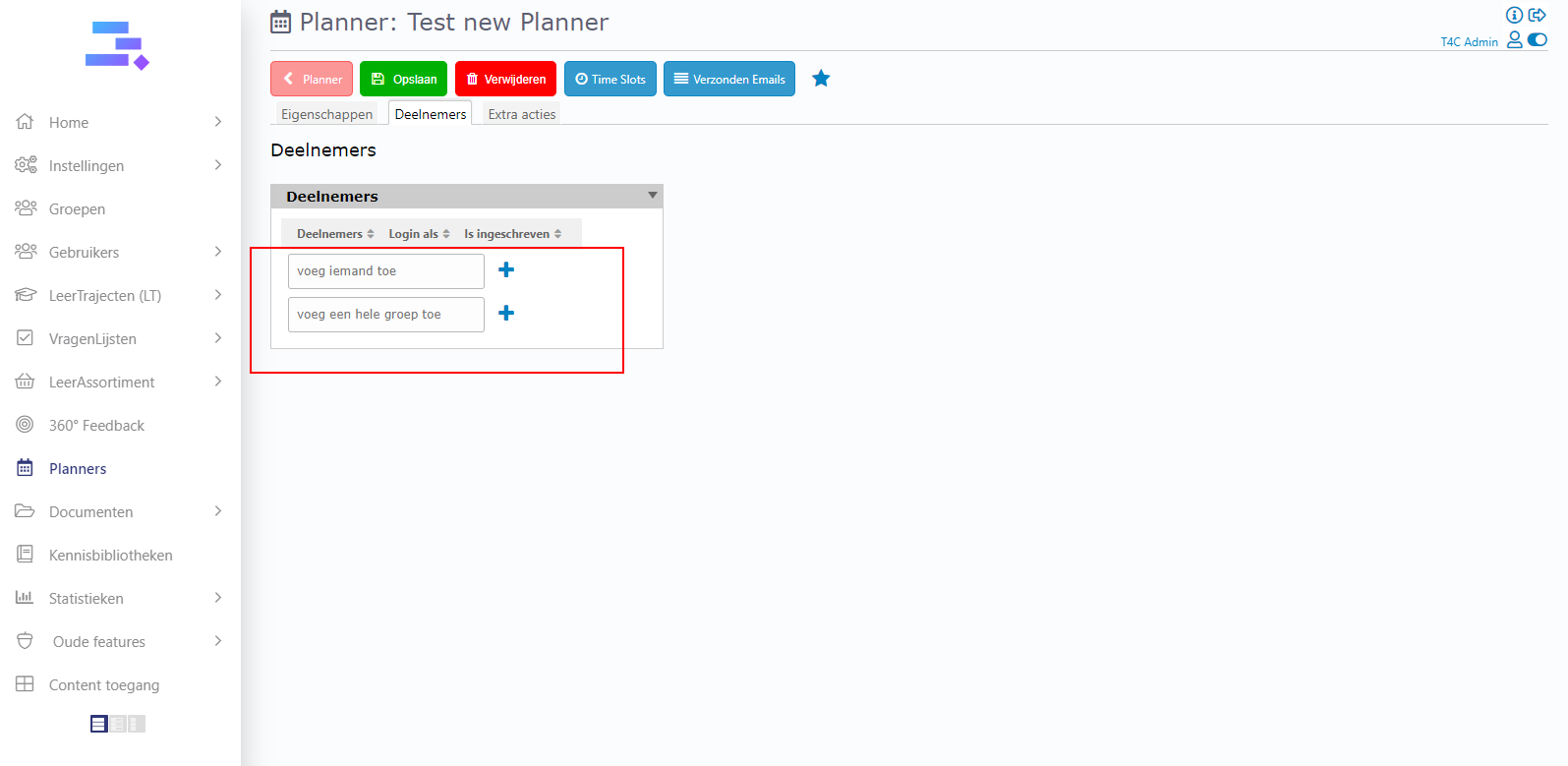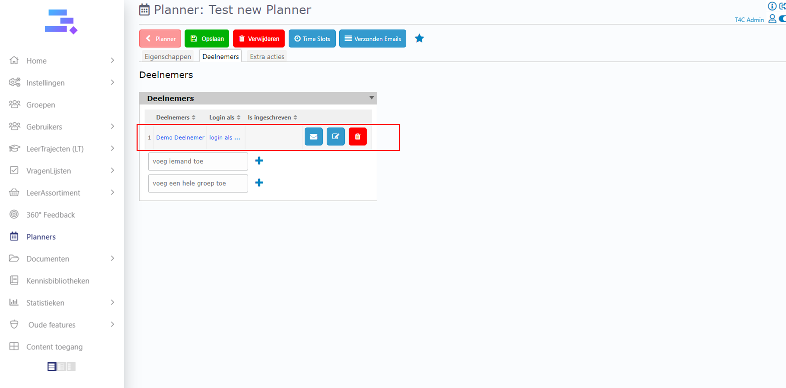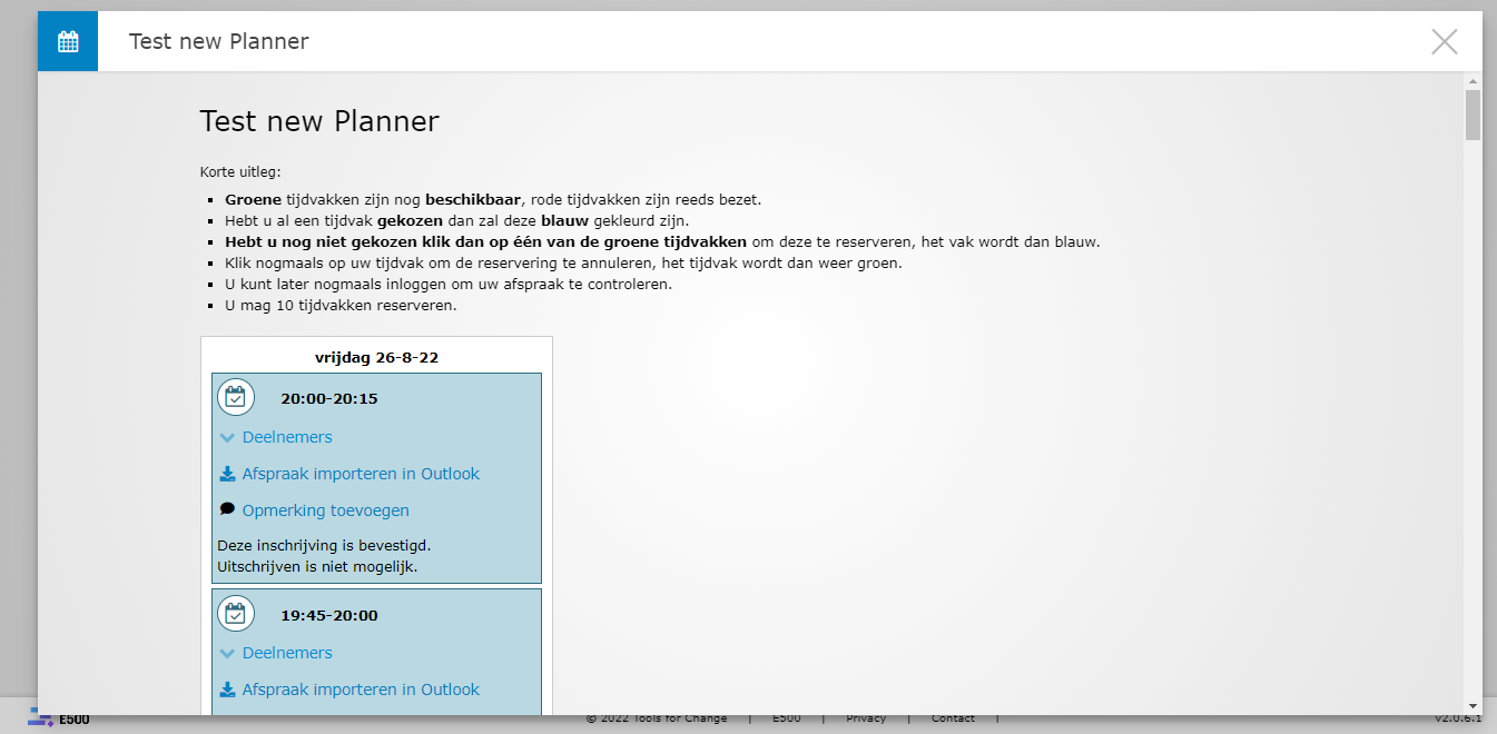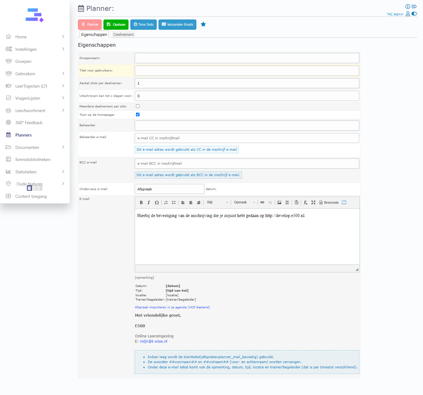 Planners’ is a functionality with which you can schedule training moments with individual participants or groups of participants. Determine which parts of the day are available on which days, inform the participants by e-mail and let them decide for themselves when they participate. The system keeps you informed of which parts of the day have been chosen and where there is still room in the schedule.