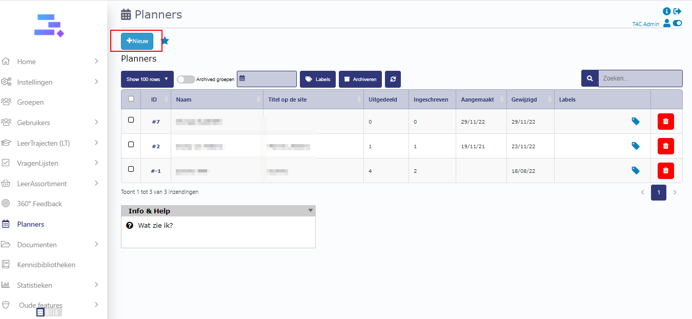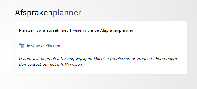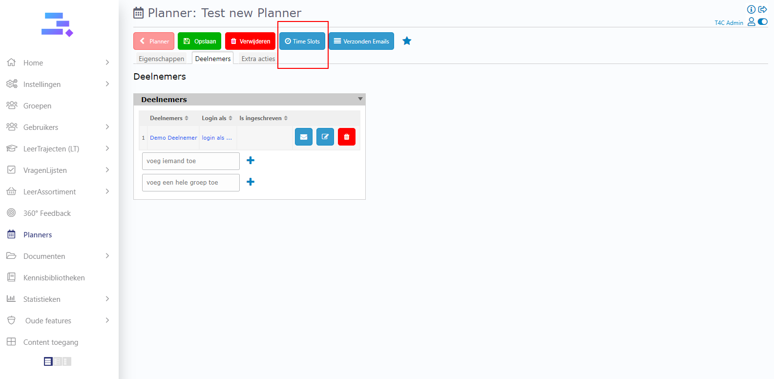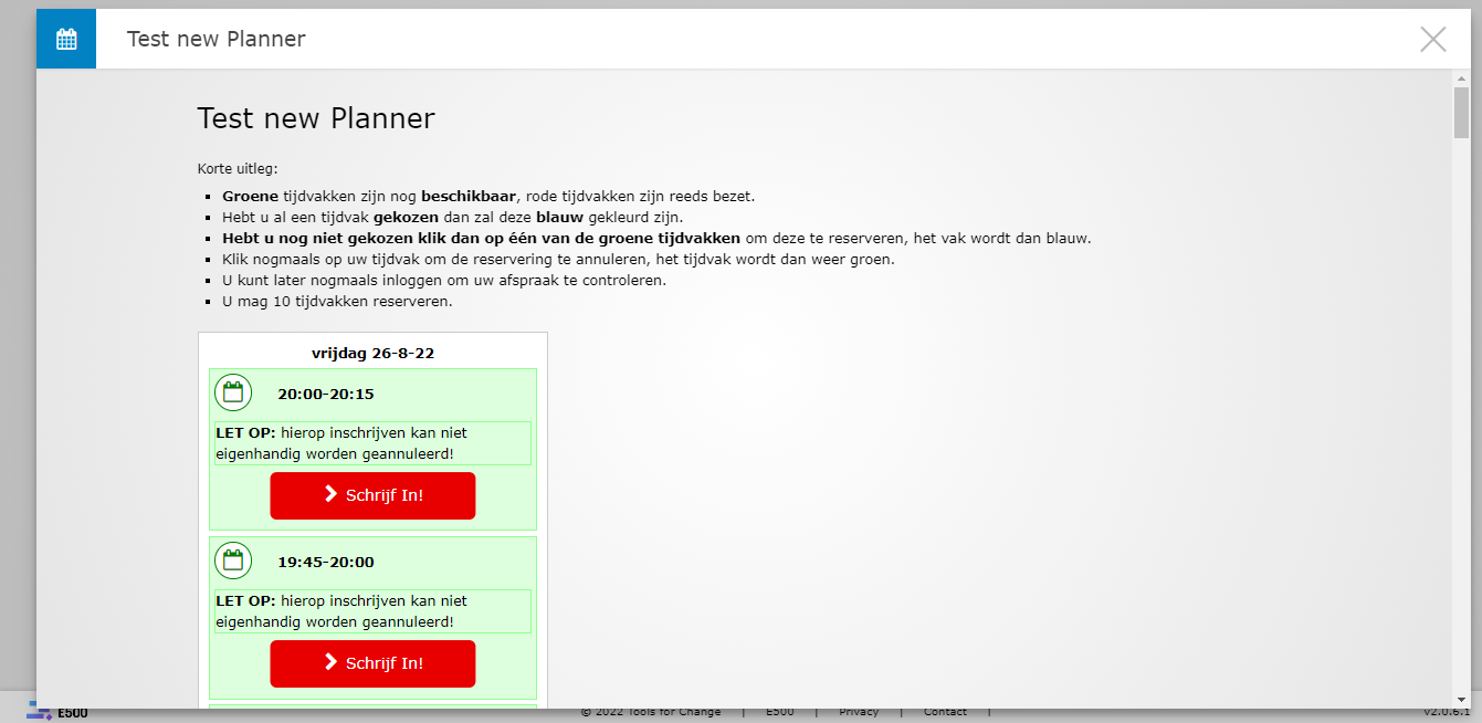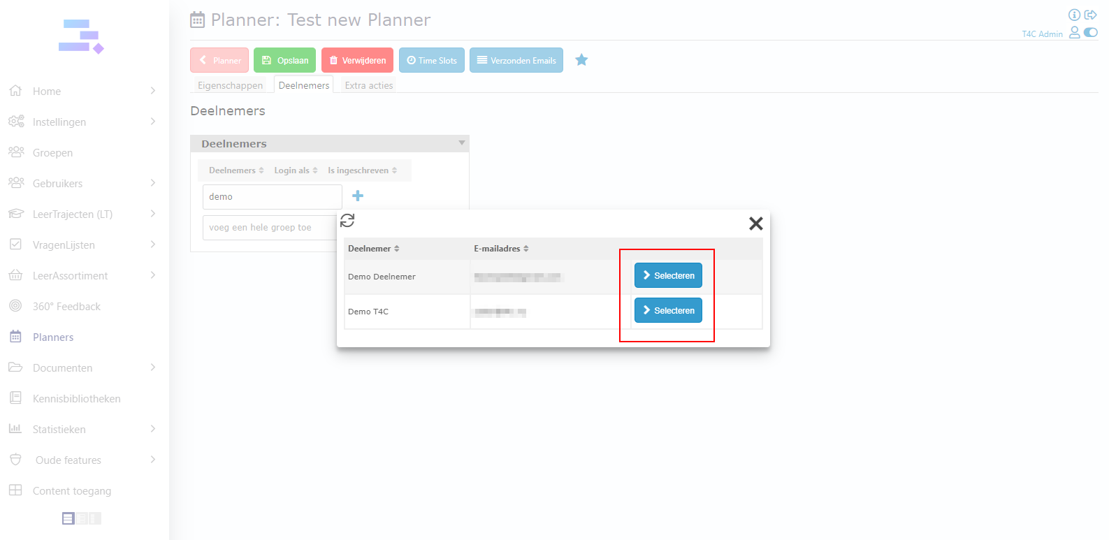 Planners’ is a functionality with which you can schedule training moments with individual participants or groups of participants. Determine which parts of the day are available on which days, inform the participants by e-mail and let them decide for themselves when they participate. The system keeps you informed of which parts of the day have been chosen and where there is still room in the schedule.