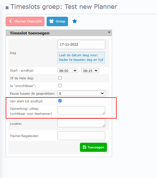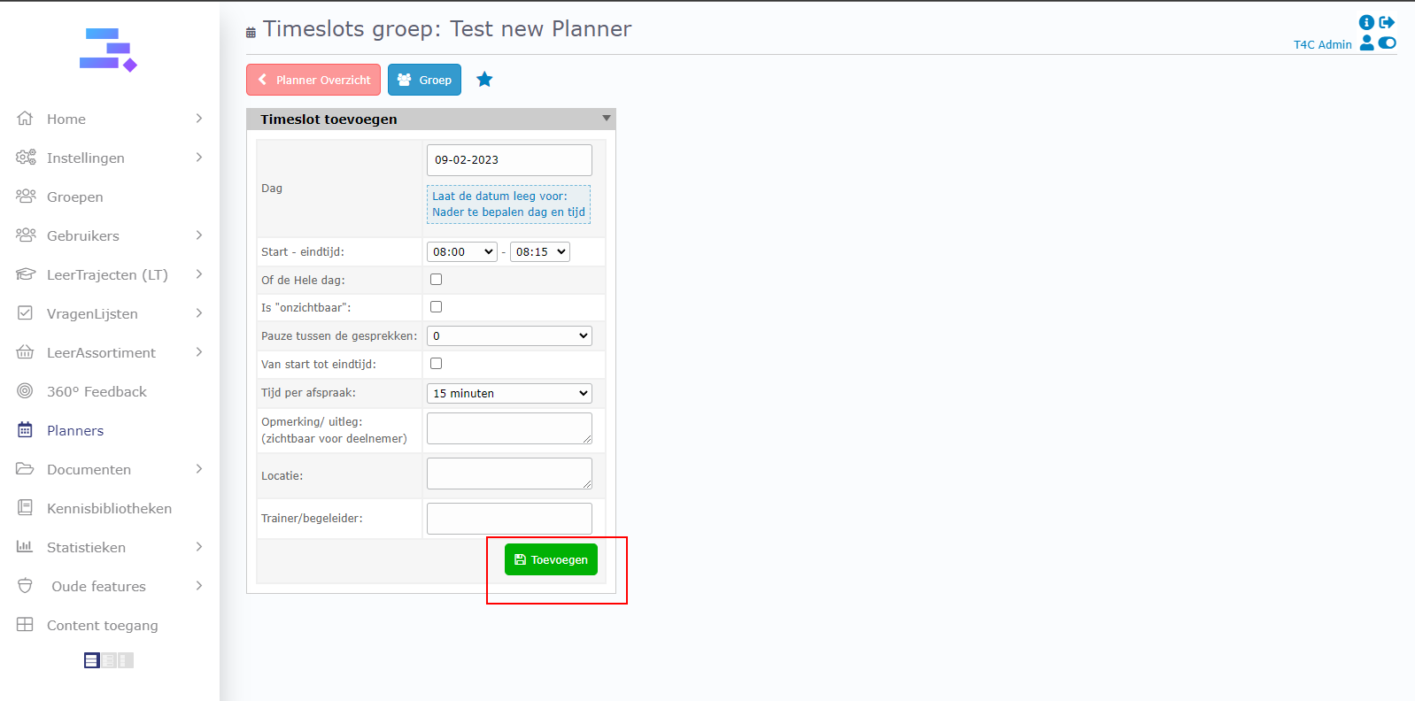 After set time, locate, note and trainner for the Plan. Click on Toevoegen button to save it.