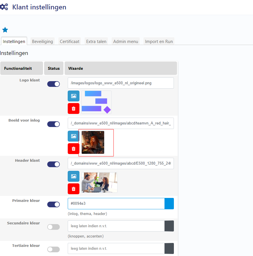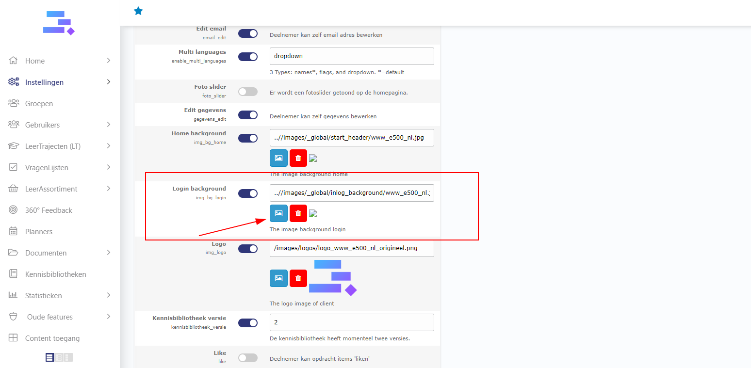 2. Then in tab Instellingen, scroll down and you can see row Login Background. Let’s active its toggle , then click on icon image to choose another image for login background of this domain.